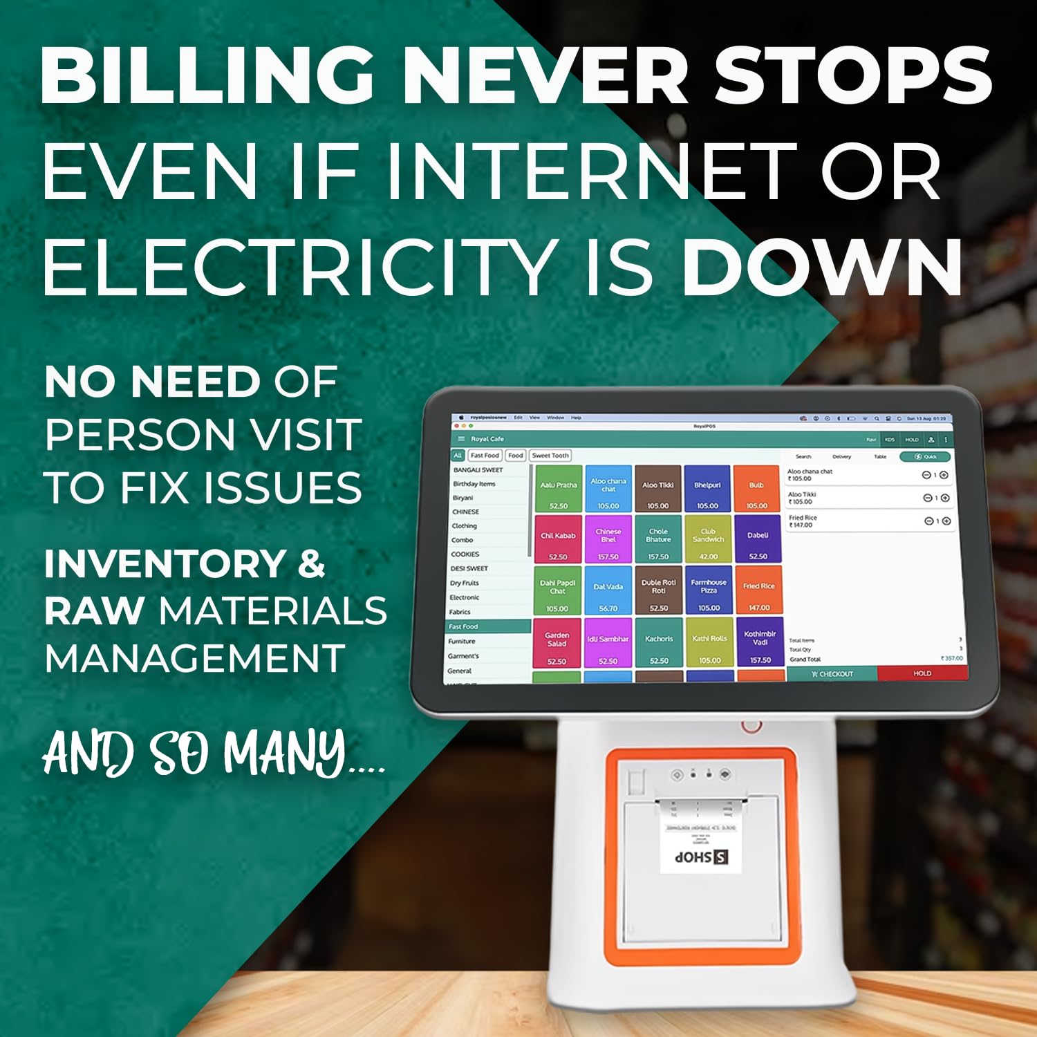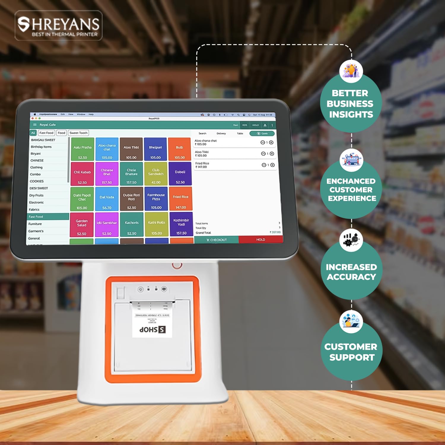 Our POS (Point of Sale) billing machine SRS95A offer several advantages for businesses, particularly in retail/ Restaurants and service industries. Efficiency: POS billing machines streamline the checkout process, reducing waiting times for customers and improving overall operational efficiency. Transactions can be processed quickly, including accepting various payment methods such as credit cards, debit cards, mobile payments, etc.