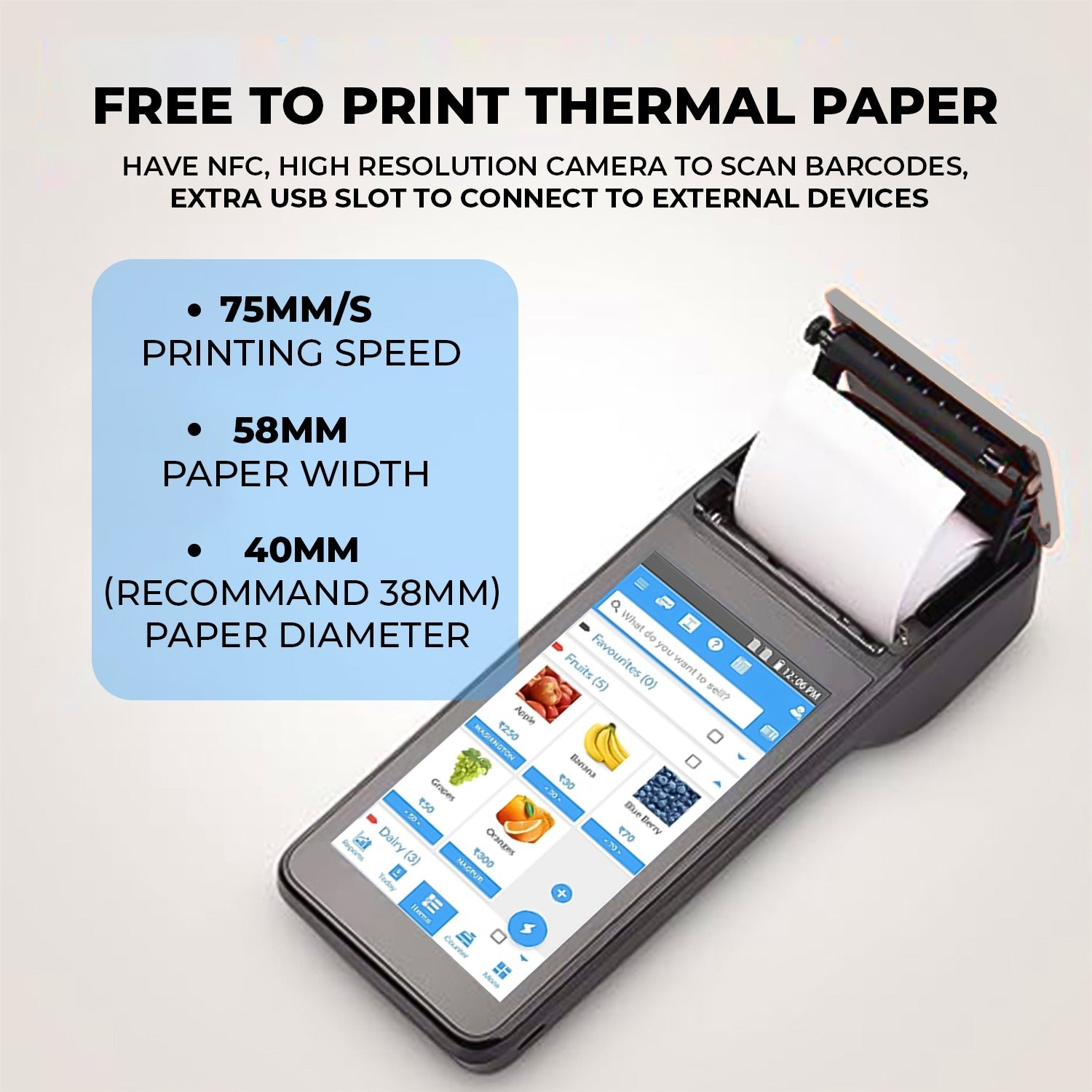 FEATURES: The Device has Inbuilt NFC/Contactless card reader & Writer, 58mm Ultra-Fast Thermal Printer ,2800mAh Large Battery Backup (Removable), 5.50 Inch Capacitive Touch Screen, Extendable Memory Card Slot, External USB Slot, Inbuilt Camera & much more which makes it Special for any application or use
